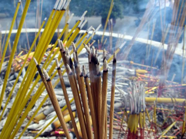 Frank and Jim, sporting Jansports and their sunblocking hats, burn incense