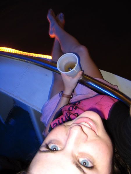 We make it to the cruise, feeling all warm and fuzzy. We’re not late, but people have already filled the top deck with chairs. So we opt for the lower deck, out in the front, which is a small area that no one has claimed yet, so we pull out 6 chairs and have a seat. The cruise was fantastic. Boozing and cruising, that’s what LSU Tigers do. We took lots of fun pictures, the lights were gorgeous, the breeze was nice, and we almost forgot that all surrounding buildings pump their sewage into the river.