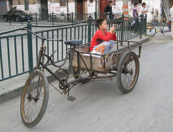 Kid sitting in rickety cart…playing on a cell phone