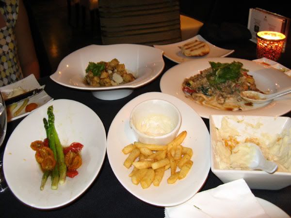 We decided on Azul again, and it started pouring in the cab on the way over. We got a little soaked in our run to the restaurant, and Pete managed to stub his toe pretty badly as well. But at least we made it, and it wasn’t crowded, and there was so much to look forward to. With only with just three of us we got a pared down version of the last meal at Azul. Hummus and Mediterranean eggplant dip for appetizers. Garlic fries, mashed potatoes, and grilled asparagus for sides. Mushroom risotto and oxtail gnocchi for entrees. And a pitcher of the blackberry sangria. Delish. Again.