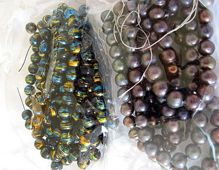 Strands of beads and pearls that need to be restrung with clasps. The pearls match the bracelet, earrings, and ring I bought at the pearl market in Beijing, and the beads I just thought were fun looking.