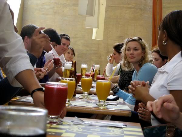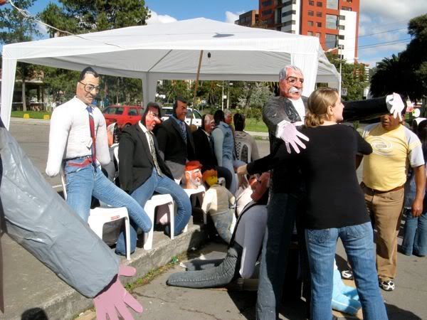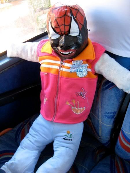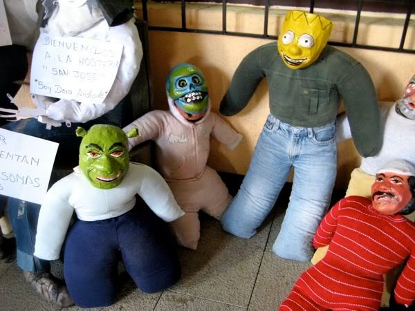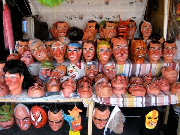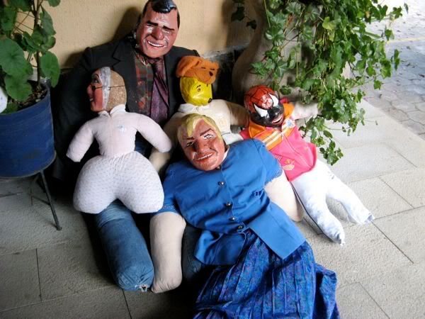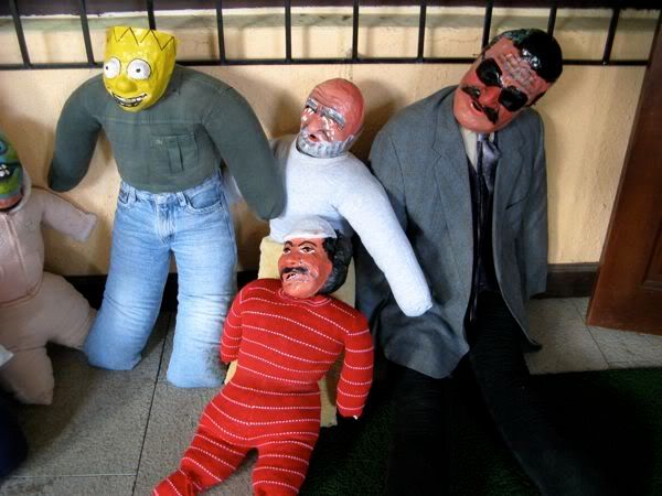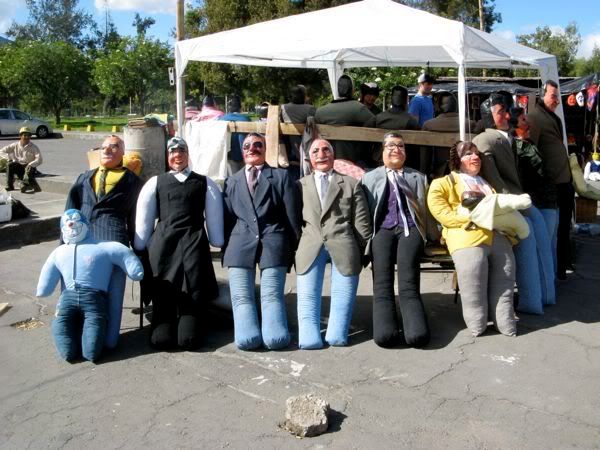 Then on the way back to the hotel we bought puppets. These are the craziness. I explained some of this earlier, but my apologies to Freddy, my longtime Ecuadorian friend, if I happen to butcher his heritage. Basically they make these puppets (which would be more accurately described as dummies, as they have no real relation to what we consider puppets). They are typically stuffed with sawdust, and wear paper mache masks. They are supposed to represent the old year. And they get burned in a farewell to the old year. Most people also write up a will for these puppets, a list of things you are leaving to the old year (I bequeath that C in Econ, and the 15 extra lbs I’ve gained). The masks are often sold separately from the bodies, and represent a number of generic faces, but also a number of celebrities, most notably politicians.