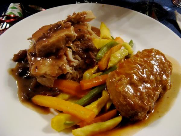 then a turkey in ginger gravy, vegetables, and pork loin in another gravy.
