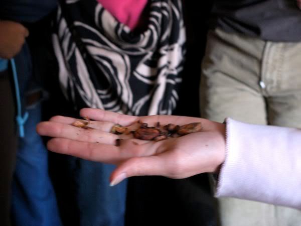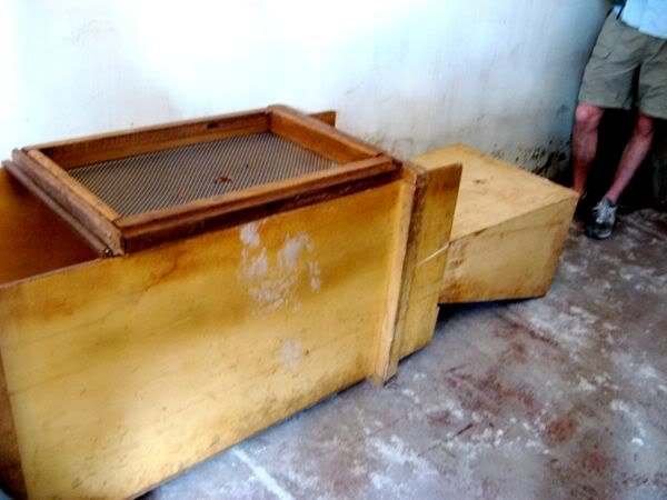 Then they put them through this “machine”. It blows air through the bottom, and they break the cacao beans over the top, press them through the sifter, and the air blows the lighter weight shells out of the way, and the chocolatey part (called nibs) fall to the bottom.