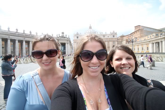 Well, we weren't actually there yet, so in the morning we woke up early and caught a train from Bari to Rome (about 4½ hours). Once in Rome, we caught a taxi to our hostel, the Orsa Maggiore, which is a former convent (and no boys allowed). Since we were in the neighborhood, we took a walk over to Vatican City, and took pictures of St. Peter’s Basilica and St. Peter’s Square (which is actually an oval). We also mailed MawMaw a postcard from the Vatican post office. Once we were done with that, it was still quite early, but since we hadn’t really done much in the way of planning, we didn’t know what else to do, so we just walked around for a few hours. It worked out great, we got to check out the Pantheon, Spanish Steps, Trevi fountain, Piazza Navona, etc. We took a guidebook recommendation and had dinner at Cacio e Pepe, a neighborhood eatery where we enjoyed wine, bread and oil, first course pasta dishes, and second course dishes, all for only 20 euros a person. Then on the walk home we got a lovely night view of a few of the scenes from earlier.